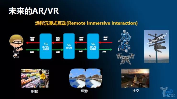 中国研究院也有非常多的智能机器人方面的研究,我们把网络和机器人连接起来,同时机器人能够把360度视频和声音实时的传输到客户端,你可以对机器人进行控制和真实的世界进行互动。这能达到什么效果呢? 就好像在任何时间你都会瞬间的转移到世界上任何一个角落,和一个真实的环境进行互动,这是我们设想的一个超越目前AR和VR远程沉浸式互动的未来。