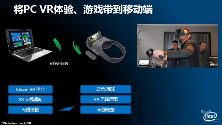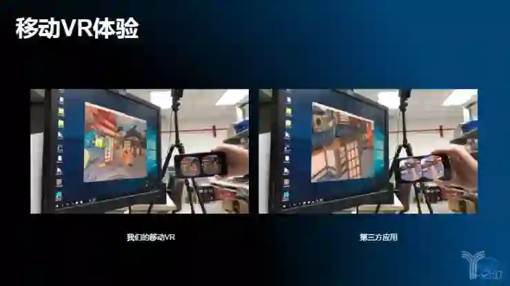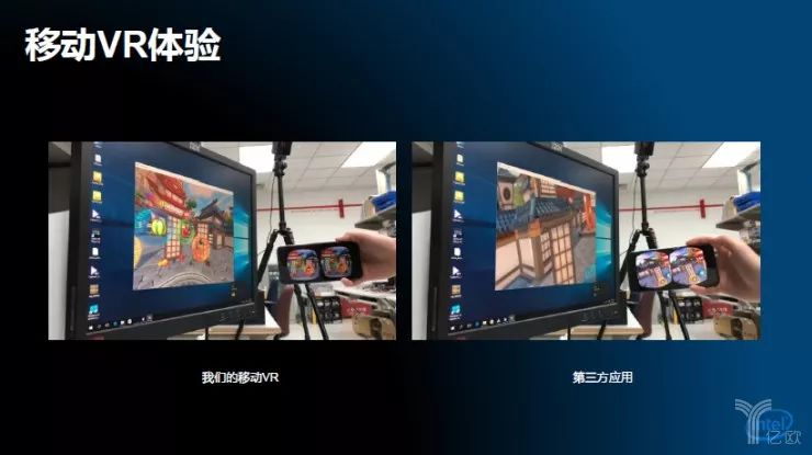 这是我们录的两段视频,左边是英特尔的移动VR系统,右边是第三方的系统。可以看到左边的系统是我们用手机拍摄下来的,是非常流畅,但是右边因为是完全靠这种PC的功能,手机端的功能比较弱,会显得非常卡顿。