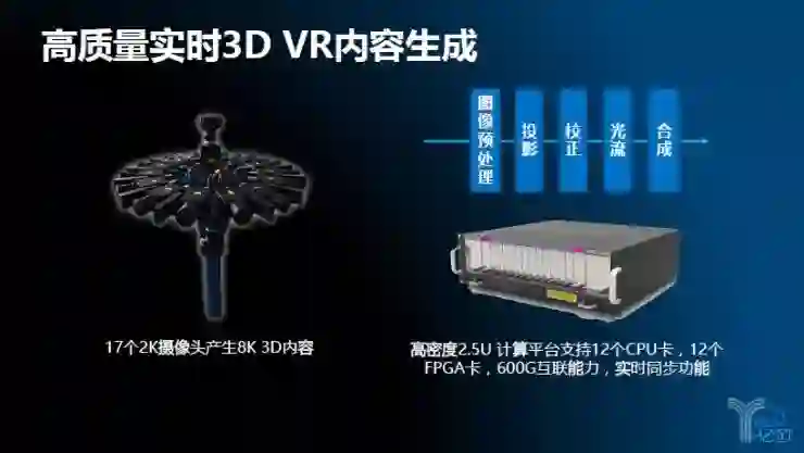 我们开发了分布式的处理平台,是非常高密度的分布式处理平台,是2.5U高的机箱,在这里可以插入12个至强CPU卡,同时插入12块FPGA卡,中间有600G左右的互联能力。 对视频VR处理来说,对实时合成来说一个主要的功能就是怎么样实现精准的同步,从处理的角度实现精准的同步,这个平台也可以支持 。 通过我们算法的研究,通过实时处理的加强,希望我们能够真正的达到产生一个非常高质量的,比如说现在产生8K的高清的内容,满足将来的要求。