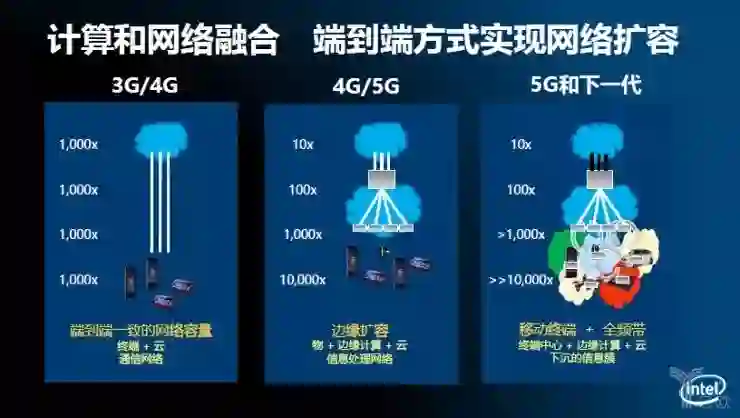 主要的出发点是数据,怎么处理数据和传输数据,特别是 5G 将来所要面对的数据洪流 。大家肯定都是对摩尔定律非常熟悉,宋院长(英特尔中国研究院院长宋继强)也介绍摩尔定律如何实现每18个月我们芯片的能力翻一番。