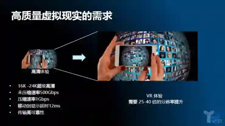 还有一点比较重要的:可靠性。 因为VR的传输它对数据传输的可靠性要求非常高 。一个视频如果离得很远,看电视的时候突然有一些瑕疵可能感觉比较明显,但不会感觉特别不舒服,但是如果一个VR眼镜在显示一个视频的时候,如果突然感觉有一帧丢失了,就需要很长的时间才能恢复出来,这时候会感觉到特别的不舒服。