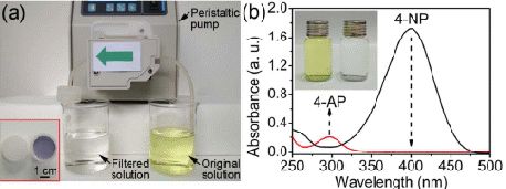 新型层状结构催化耐火纸在流动催化反应中表现出优异的催化性能,在室温下含有4-硝基苯酚和硼氢化钠的水溶液只要倾倒在新型催化耐火纸上,就像水溶液过滤一样很快流过催化耐火纸,催化反应就完成了,催化效率高达~100%