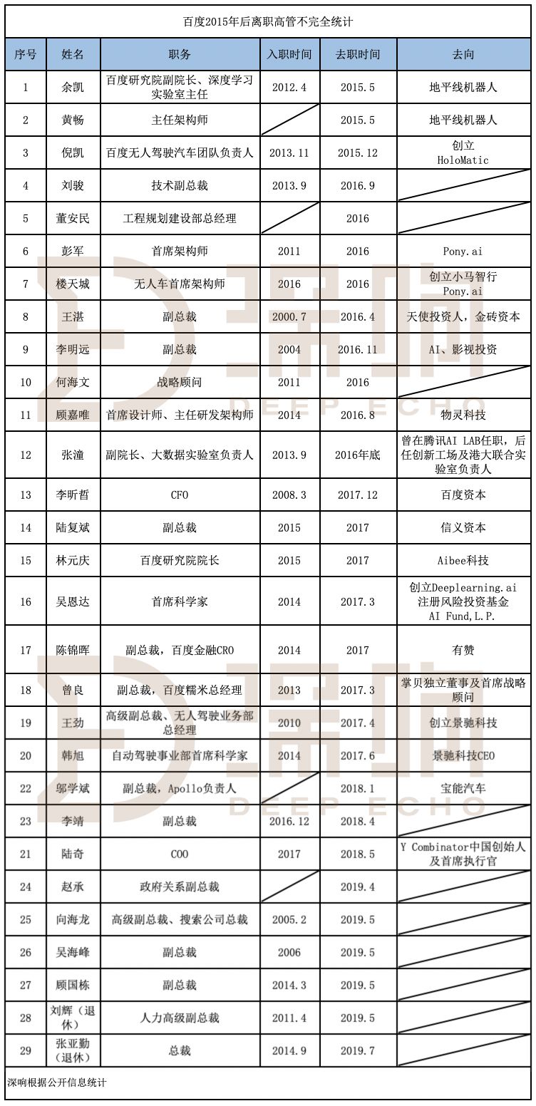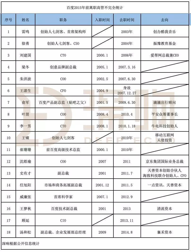 据不完全统计,过去十年,百度有接近十位顶级研发人员、二十多位副总及以上级别高管离职。而这股“高管”离职潮在近4年百度业务屡屡受挫的波折间,显得更为频繁。