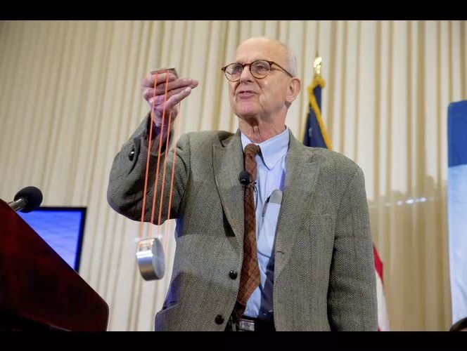 韦斯在演示激光干涉仪中挂反射镜的悬摆原理。