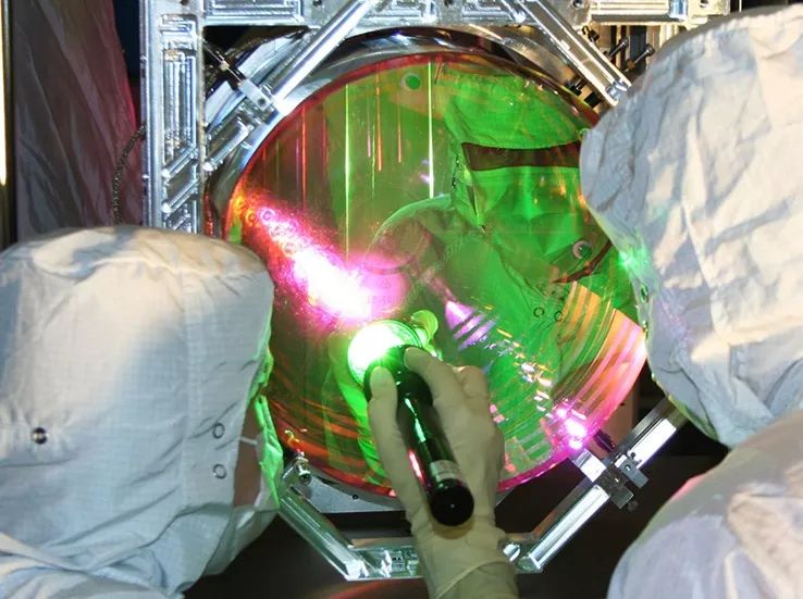 LIGO工作人员在检查涂膜后的反射镜镜面。