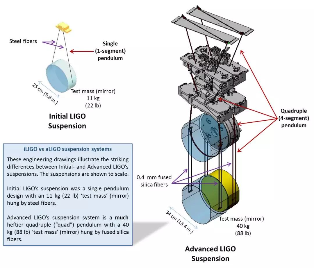 iLIGO(左上小图)和aLIGO(大图)悬挂镜子方式的比较。