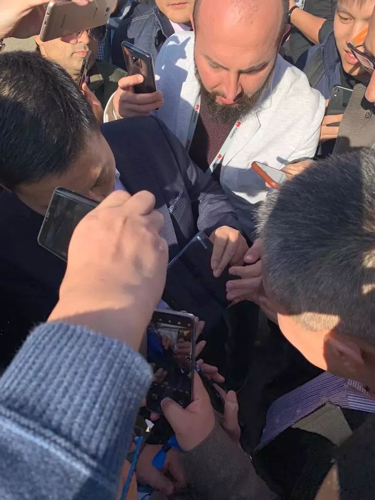 短短一小时发布会结束,余承东在发布会后心情不错,出现在场馆外遭到围堵并展示5G折叠屏手机。