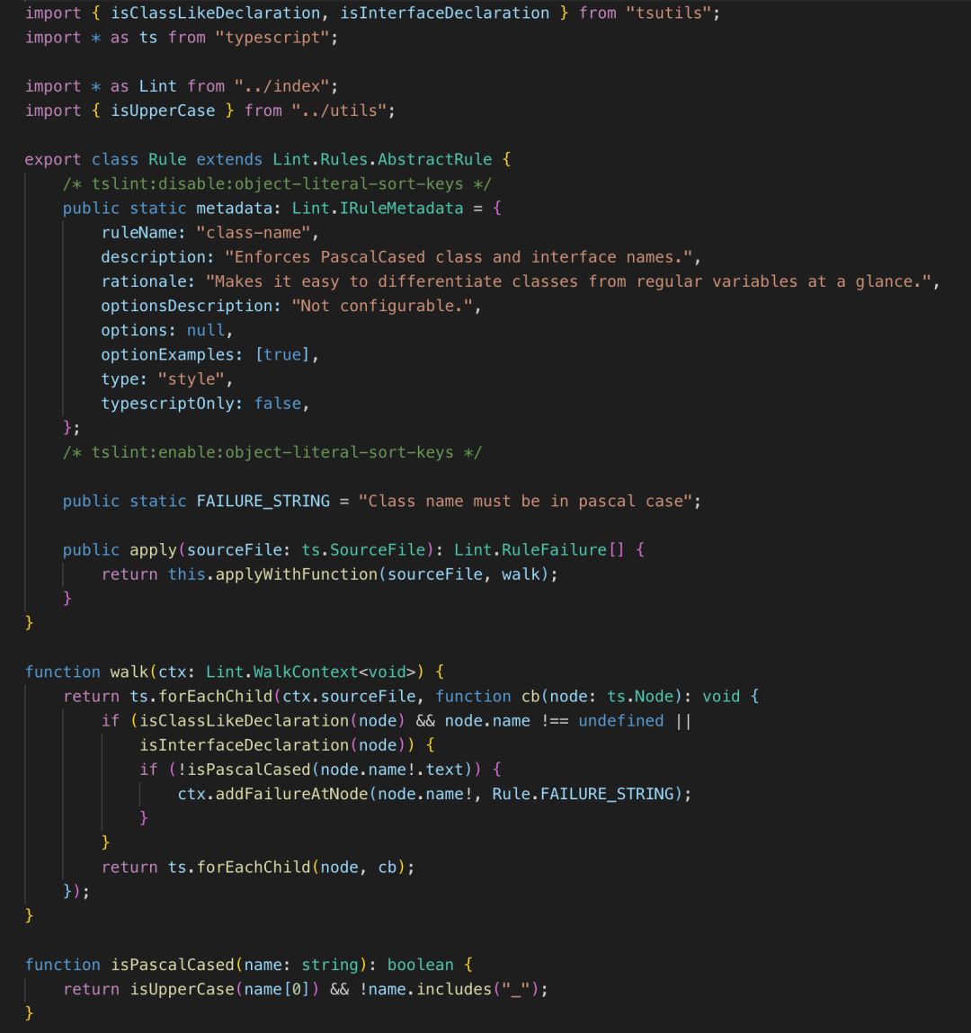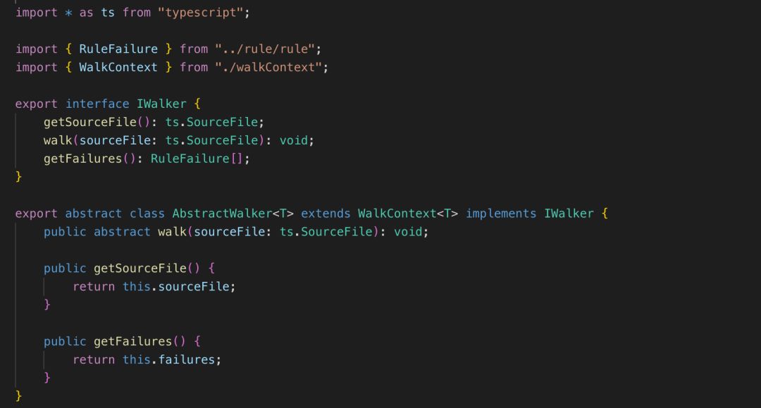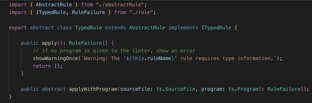 规则的类名是Rule,并且要继承Lint.Rules.AbstractRule这个类型,当然也可能有继承TypedRule这个类的时候,但是我们通过阅读源码发现,其实它也是继承自Lint.Rules.AbstractRule这个类。