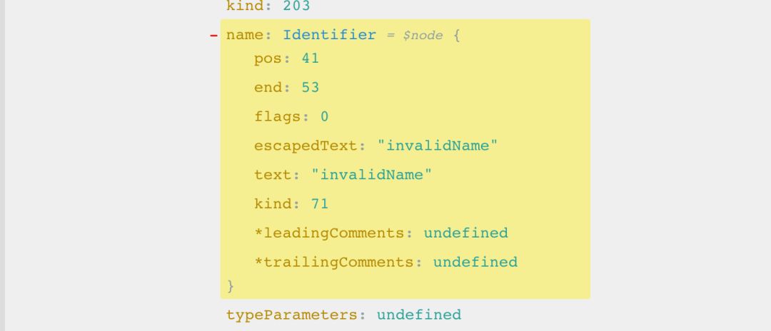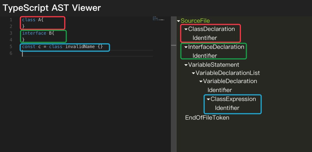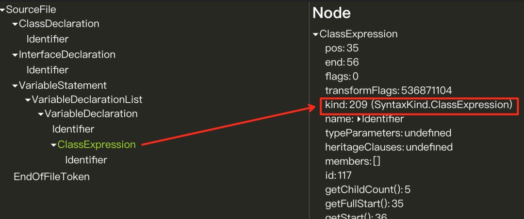 其中kind为当前节点的类型,当然Node是所有节点的基类,它的实现还包括Statement、Expression、Declaration等,回到开头这个"class-name"规则,我们的所有声明类主要是class与interface关键字,分别对应ClassExpression、ClassDeclaration、InterfaceDeclaration, 我们可以通过上步提到的AST语法树工具,在语法树中看到其为一一对应的。