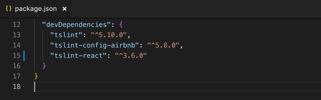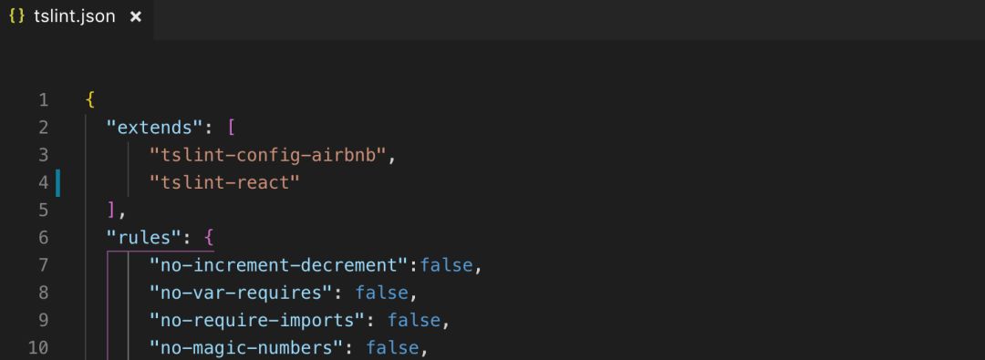 其中extends数组内放置继承的TSLint规则包,上图包括了airbnb配置的规则包、tslint-react的规则包,而rules用于配置规则的开关。