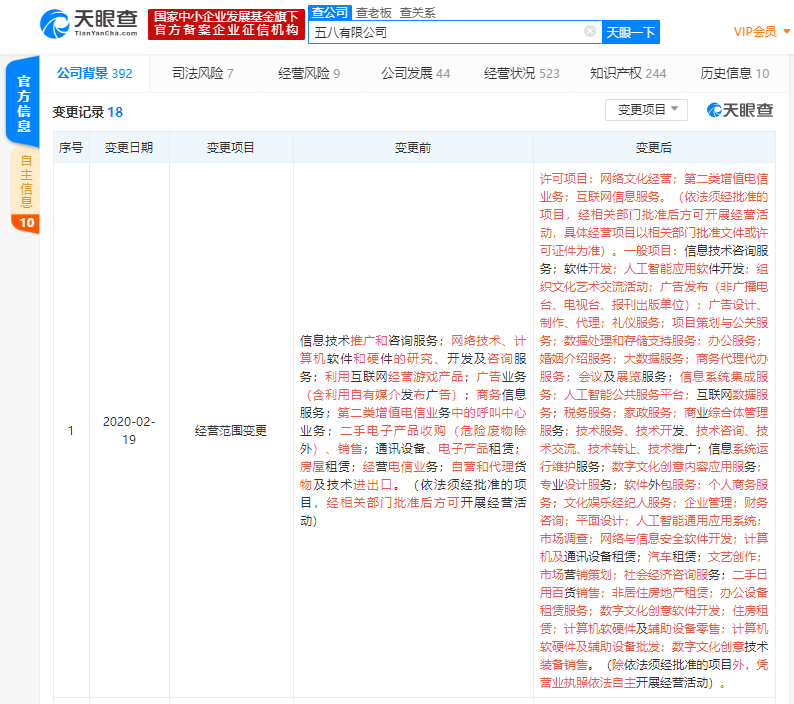 天眼查数据显示,2月19日,五八有限公司发生经营范围变更,新增人工智能应用软件开发、人工智能公共服务平台、人工智能通用应用系统等,同时还新增文化娱乐经纪人服务、数字文化创意软件开发等。五八有限公司成立于2011年7月,法定代表人为58同城CEO姚劲波,由58同城的运营主体北京五八信息技术有限公司全资控股。(36氪)