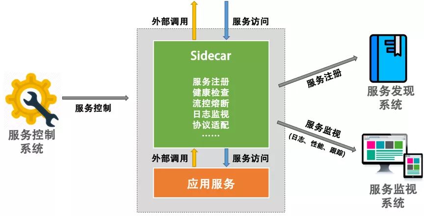 该 sidecar proxy 负责接管对应服务的入流量和出流量。并将微服务架构中以前有公共库、framework实现的熔断、限流、降级、服务发现、调用链分布式跟踪以及立体监控等功能从服务中抽离到该 proxy 中:
