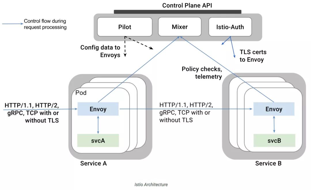 Mixer: Mixer在应用程序代码和基础架构后端之间提供通用中介层。它的设计将策略决策移出应用层,用运维人员能够控制的配置取而代之。应用程序代码不再将应用程序代码与特定后端集成在一起,而是与Mixer进行相当简单的集成,然后Mixer负责与后端系统连接。也就是说,Mixer可以认为是其他后端基础设施(如数据库、监控、日志、配额等)的sidecar proxy: