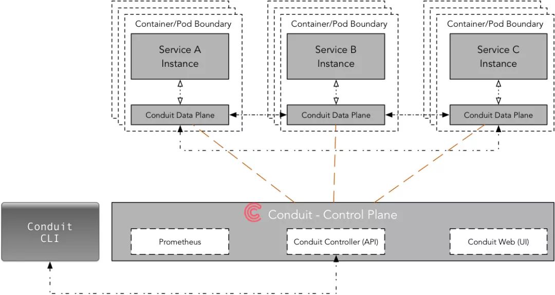 Conduit 各方面的设计理念与 Istio 非常类似。但是作者抛弃了 Linkerd, 使用Rust重新编写了sidecar, 叫做 Conduit Data Plane, 控制面则由Go编写的 Conduit Control Plane接管: