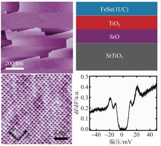 “单薄纤毫”的高温超导。优化制备方法后的FeSe块体最高Tc是9 K,高压下能达到 38 K,还能不能进一步提高?答案是肯定的。这需要小到 FeSe的“一根毫毛”——只有一个 Fe 和 Se 原子层的材料:FeSe 单原子层薄膜,简直是一层薄到无法再薄的薄膜。清华大学薛其坤研究组发现,如果把 FeSe单原子层薄膜镀在 SrTiO3衬底上,其超导能隙最大能达到 20 meV,Tc将可以突破65 K以上(图 5)!更神奇的是,如果镀上两个原子层的 FeSe薄膜,它就不超导了;如果镀在其他衬底如石墨烯等上,它也不超导!中科院物理所周兴江研究组以及复旦大学的封东来研究组等对其微观电子态的研究表明,单层 FeSe薄膜是电子型的铁基超导体,其物理相图和铜氧化物高温超导有所类似,SrTiO3衬底或许在载流子或电子—声子耦合方面帮助了超导的实现。上海交大贾金锋研究组的输运实验还说明,该材料有可能具有 100 K 以上的超导临界温度,虽未能进一步确认,但即便是 65 K也是铁基超导体中的最高记录了。至今,为何如此“单薄”的铁硒超导体具有如此之高的 Tc,仍然是一个谜团。单层FeSe的探索之路给科学家们许多重要的启示,寻找高温超导,或许可以“直捣底层”从原子层和界面上去设计材料,而不是单纯寻找块体材料的超导电性。