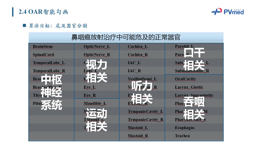 放疗会出现口干(进食困难)、放射性脑脊髓病等并发症,主要一大原因即危机器官受到影响。针对鼻咽癌放疗的临床需求,柏视大概共分割出临床上需要保护的43个器官,包括中枢神经、视力、运动、听力、口干和吞咽相关的六大部分器官,据调研,目前关于上述器官分割报道并未出现。