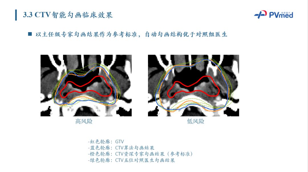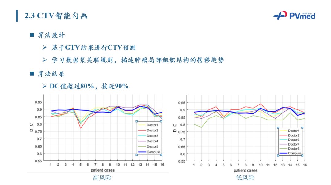 对于CTV预测临床效果,在图中可以看到,无论是高风险还是低风险的CTV预测,预测结果和参考的资深医生勾画的CTV轮廓是基本一致的。 相较于资历较浅医生所勾画的CTV,自动预测的CTV精准度高于对比医生的平均水平。