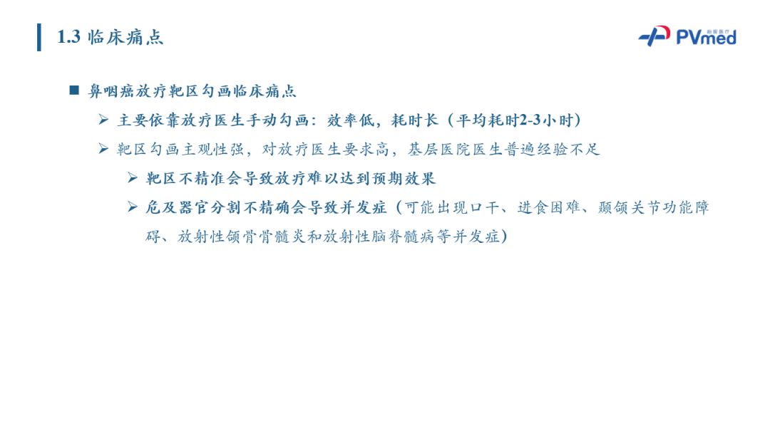 鼻咽癌放疗靶区勾画另一临床痛点即靶区勾画主观性强,对放疗医生要求高。基层医院医生普遍经验不足,独立完成靶区勾画较难。这会导致两方面的问题:一方面即靶区不精准会导致放疗难以达到预期效果;第二方面即危机器官分割不精确、对危机器官过量照射会导致并发症。譬如可能出现口干、进食困难、颞颌关节功能障碍、放射性颌骨骨髓炎和放射性脑脊髓病等并发症,这会影响病患生活的质量。