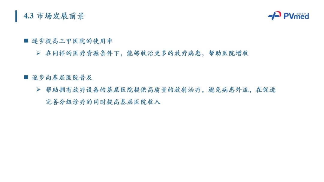 另一方面,放疗市场近年来也在不断的增长,国内放疗市场年复合增长率约为25%,2015年已达269亿。目前放疗采用率还处于较低水平,随着放疗采用率的逐步提高,放疗市场还有较大的上升空间。如果放疗采用率达到理论推荐的70%,我国放疗的市场空间则将达到800 亿。总体来看,放疗靶区勾画的市场发展方向非常好。作为提供靶区勾画产品和服务的企业而言,它更重要的是把握市场拓展的路线和方向。一方面逐步提高三甲医院的使用率,在同样的医疗资源条件下,能够收治更多的放疗病患,帮助医院增收。另一方面,逐步向基层医院普及,帮助拥有放疗设备的基层医院提供高质量的放射治疗,避免病患外流,在促进完善分级诊疗的同时提高基层医院收入。