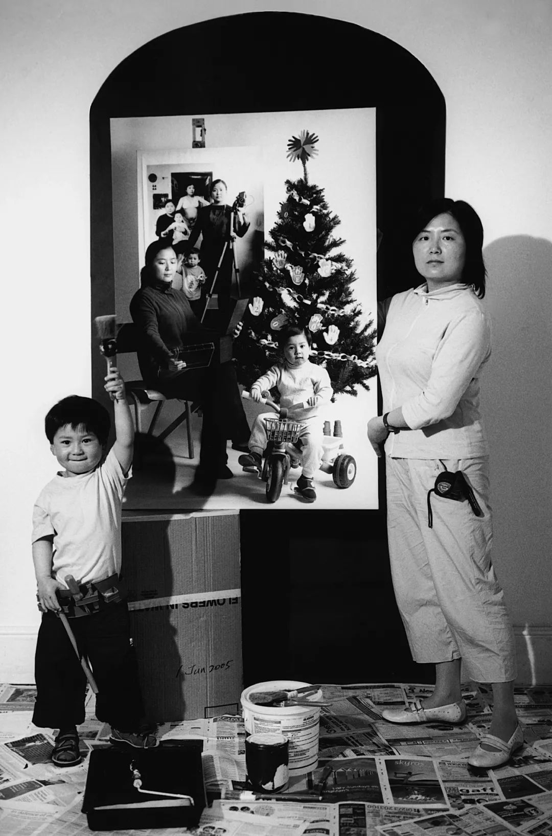 这张照片中,我没有牵着小孩,而是用两只手来面对我的作品、打开我的作品,当然,我的脚还是跟他连在一起的。