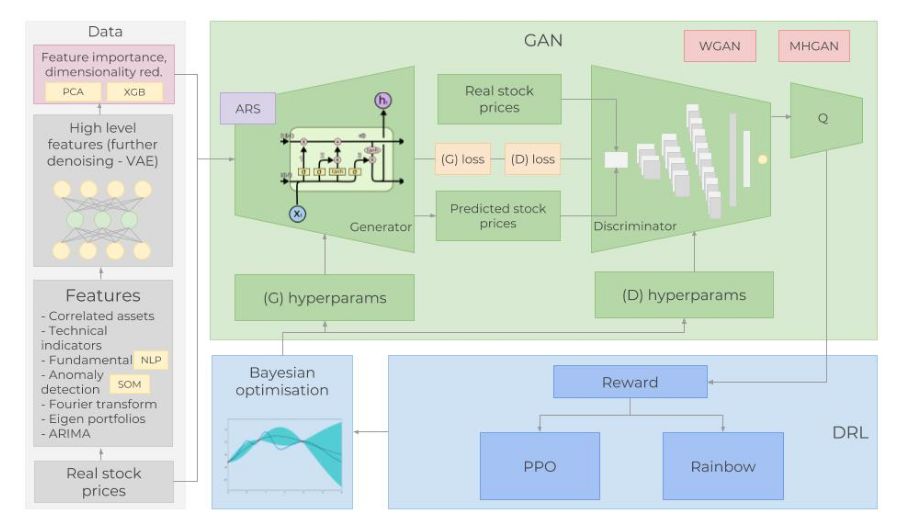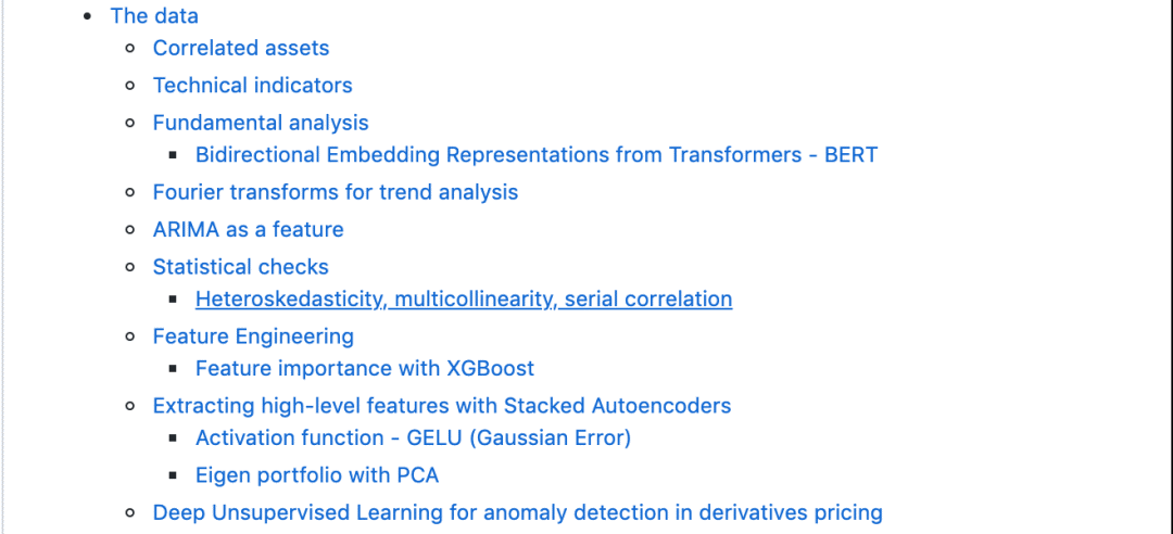 此外,在模型中还使用许多不同类型的输入数据。随着股票的历史交易数据和技术指标,设计了一些技术方法,如使用 NLP 中的 BERT 来创建情绪分析模型(作为基本面分析的来源),以及用傅立叶变换(Fourier transforms)提取总体趋势方向、识别其他高级特征的栈式自动编码器( Stacked autoencoder);采用特征投资组合寻找相关资产;采用 ARIMA 方法进行股票函数近似。实际上,这些技术都是为了尽可能多的获取关于股票的信息、模式、依赖关系等等。