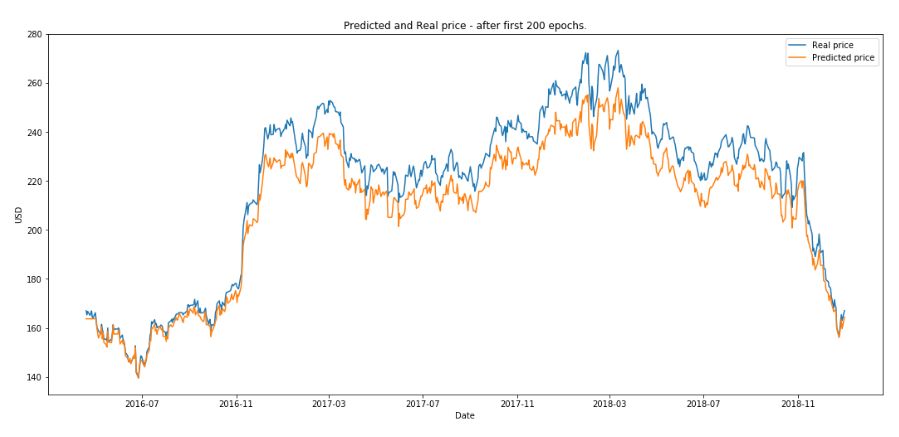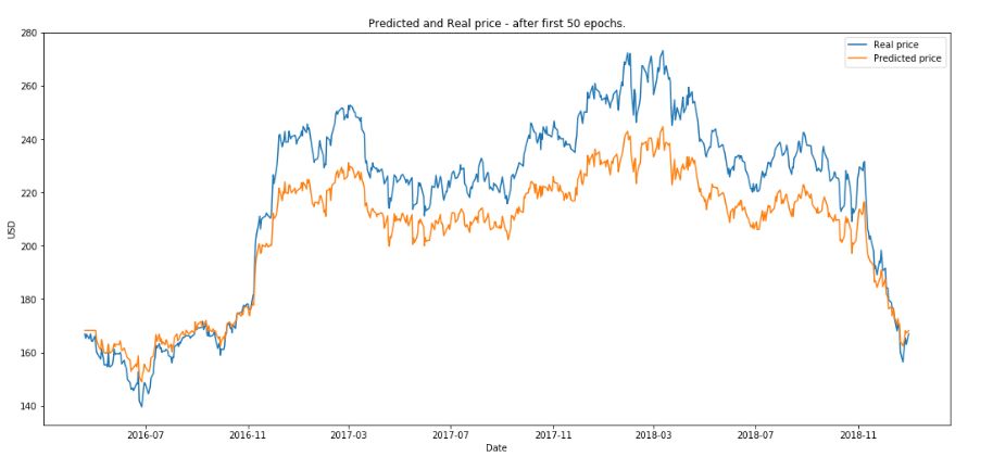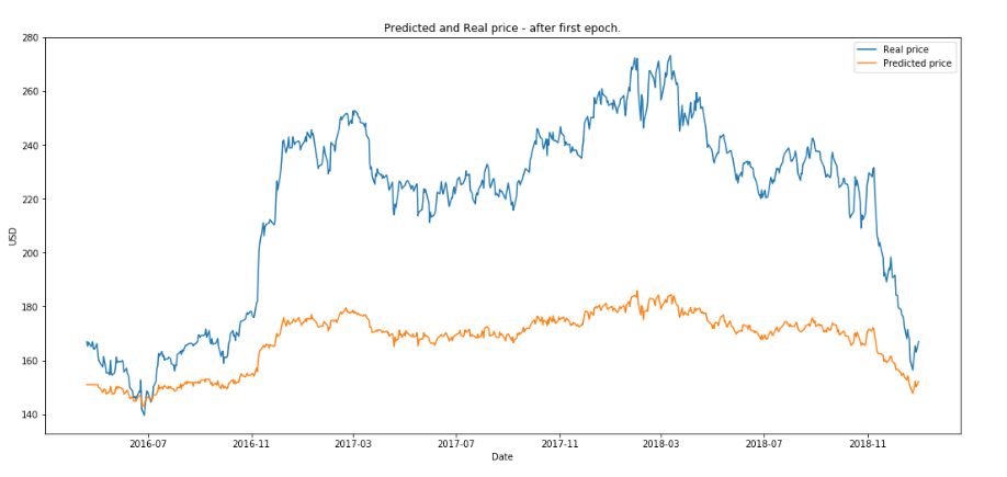 LSTM架构非常简单:一个LSTM层,包含112个输入单元(数据集中有112个特征)和500个隐藏单元;一个以每日股价为输出的 Dense 层;采用 Xavier 初始化,使用 L1 损失函数