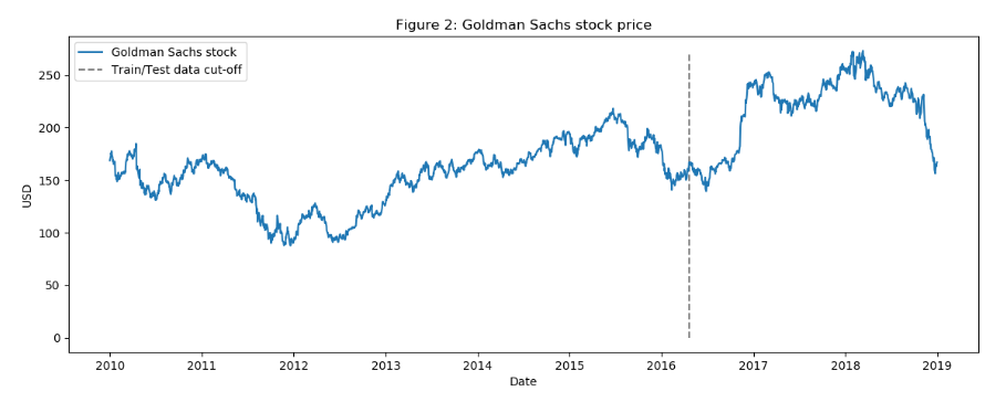 plt.figure(figsize=(14, 5), dpi=100)plt.plot(dataset_ex_df['Date'], dataset_ex_df['GS'], label='Goldman Sachs stock')plt.vlines(datetime.date(2016,4, 20), 0, 270, linestyles='--', colors='gray', label='Train/Test data cut-off')plt.xlabel('Date')plt.ylabel('USD')plt.title('Figure 2: Goldman Sachs stock price')plt.legend()plt.show()