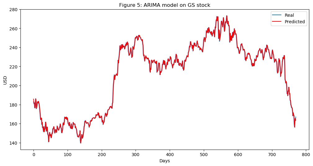 from pandas import read_csvfrom pandas import datetimefrom statsmodels.tsa.arima_model import ARIMAfrom sklearn.metrics import mean_squared_errorX = series.valuessize = int(len(X) * 0.66)train, test = X[0:size], X[size:len(X)]history = [x for x in train]predictions = list()for t in range(len(test)):model = ARIMA(history, order=(5,1,0))model_fit = model.fit(disp=0)output = model_fit.forecast()yhat = output[0]predictions.append(yhat)obs = test[t]history.append(obs)error = mean_squared_error(test, predictions)print('Test MSE: %.3f' % error)Test MSE: 10.151# Plot the predicted (from ARIMA) and real pricesplt.figure(figsize=(12, 6), dpi=100)plt.plot(test, label='Real')plt.plot(predictions, color='red', label='Predicted')plt.xlabel('Days')plt.ylabel('USD')plt.title('Figure 5: ARIMA model on GS stock')plt.legend()plt.show