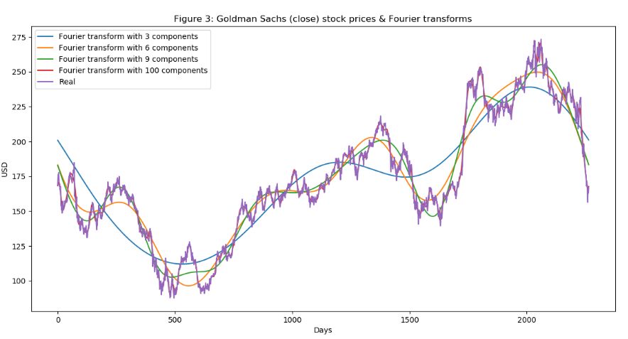 data_FT = dataset_ex_df[['Date', 'GS']]close_fft = np.fft.fft(np.asarray(data_FT['GS'].tolist()))fft_df = pd.DataFrame({'fft':close_fft})fft_df['absolute'] = fft_df['fft'].apply(lambda x: np.abs(x))fft_df['angle'] = fft_df['fft'].apply(lambda x: np.angle(x))plt.figure(figsize=(14, 7), dpi=100)fft_list = np.asarray(fft_df['fft'].tolist())for num_ in [3, 6, 9, 100]:    fft_list_m10= np.copy(fft_list); fft_list_m10[num_:-num_]=0    plt.plot(np.fft.ifft(fft_list_m10), label='Fourier transform with {} components'.format(num_))plt.plot(data_FT['GS'],  label='Real')plt.xlabel('Days')plt.ylabel('USD')plt.title('Figure 3: Goldman Sachs (close) stock prices & Fourier transforms')plt.legend()plt.show()
