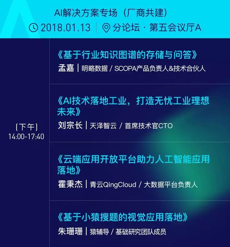 “AI 解决方案专场”:来自青云、明略数据等企业的技术专家们将就他们如何落地 AI,如何利用知识图谱数据存储、优化搜索引擎、实现复杂推理,构建智能对话机器人的框架和方法,AI 应用于具体工业场景的技术框架和设计理念,如何利用云端的数据和计算能力为 AI 加码等进行「巅峰级」论道。