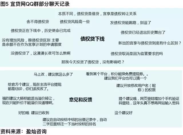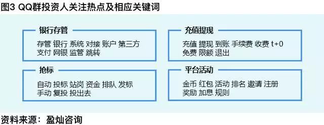 根据上表及其余关键词数据,我们基本可以推断出QQ群投资人关注点集中在银行存管、充值提现、抢标困难、平台活动等方面。