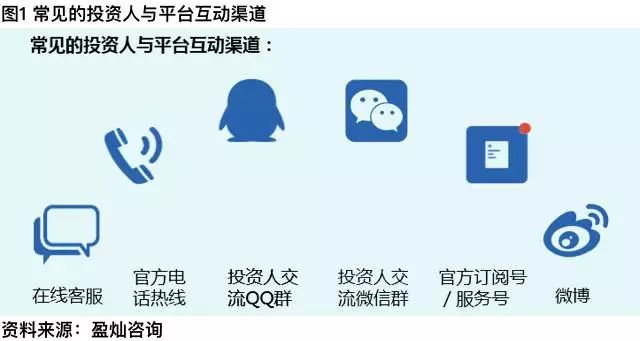 目前,投资人与平台互动的渠道由在线客服、官方电话热线、官方的投资人交流QQ群及微信群、微信服务号及订阅号、微博等组成。