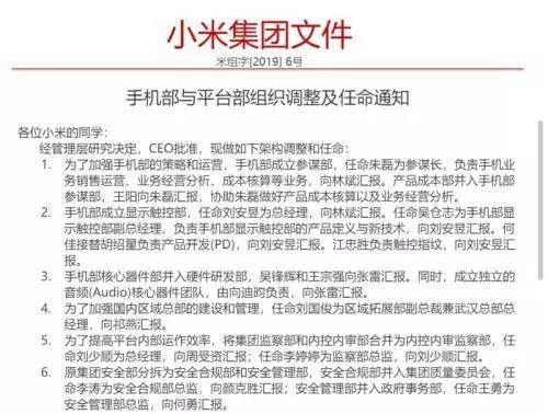 2 月 18 日,小米集团发布内部邮件,宣布手机部和平台部组织调整:手机部成立参谋部,任命朱磊为参谋长,负责手机业务销售运营、业务运营分析等业务;手机部成立显示触控部,核心器件部并入硬件研发部;原集团安全部拆分为安全合规部和安全管理部。