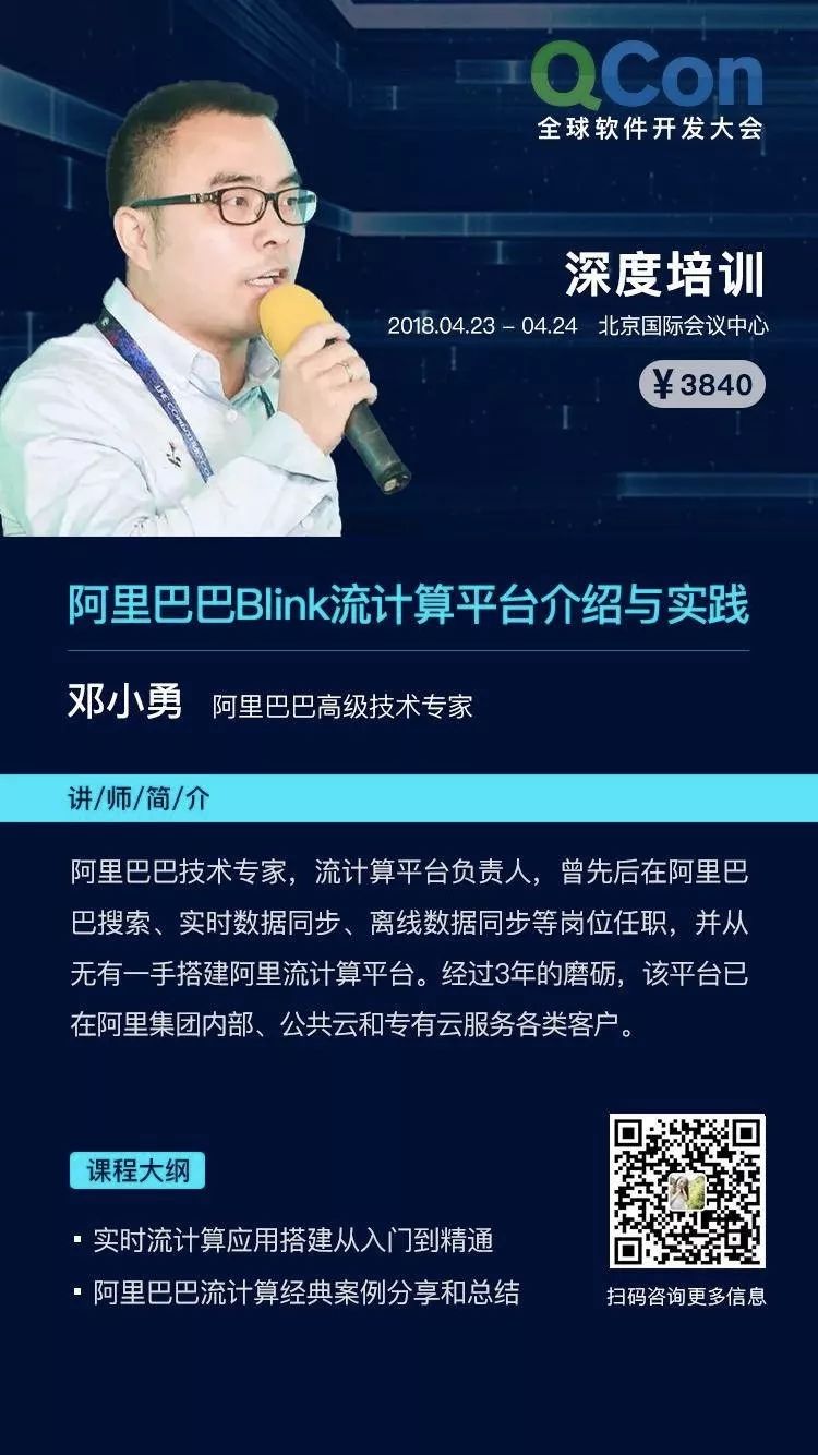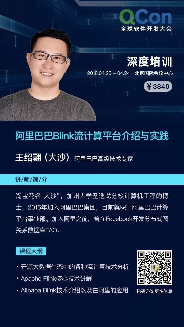 如果想对 Blink 有更深入的了解,请关注 2018 年 4 月 23 日至 24 日,我们在北京国际会议中心举办的 QCon 深度培训。在会上,阿里巴巴的高级技术专家王绍翾和邓小勇将为大家带来阿里巴巴 Blink 流计算平台介绍与实践,讲述阿里巴巴在超大规模和复杂实时业务场景下,如何基于 Blink 引擎打造流计算平台,干货满满。现在 报名立享 8 折优惠,点击 “阅读原文” 即可了解更多详情。