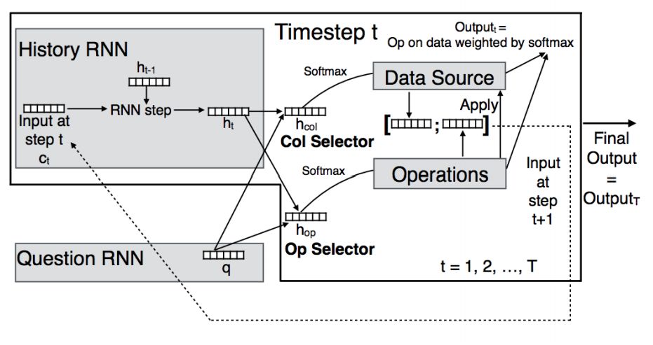 两种模型存在一些有趣的差异。神经编程器设计为使用自然语言输入。当然,它们通过 RNN 控制器变成向量化的嵌入格式,但是该模型仍然需要学习英语的语义。类似地,神经编程器具备使之在存储上执行数据库类型运算的模块,该模型可从数据库中返回多个元素。从这个层面上看,神经编程器是为了成为一个自动问答系统,学习回答问题所需的潜在程序。因此,解决方案可能是综合的,但是比问题中存在表征的情况需要的步骤要少一些。