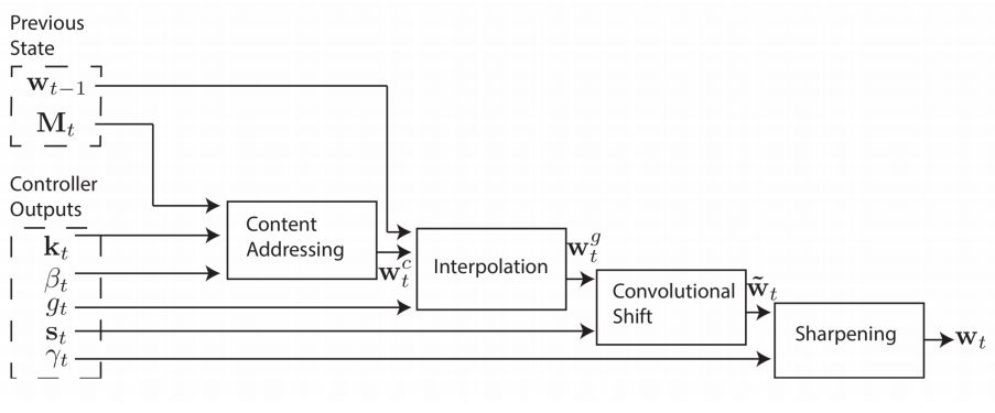 图 4. 通过基于内容求解的注意力步骤以获得读取输出 w_t。控制器(LSTM)的输出是完全可微的。