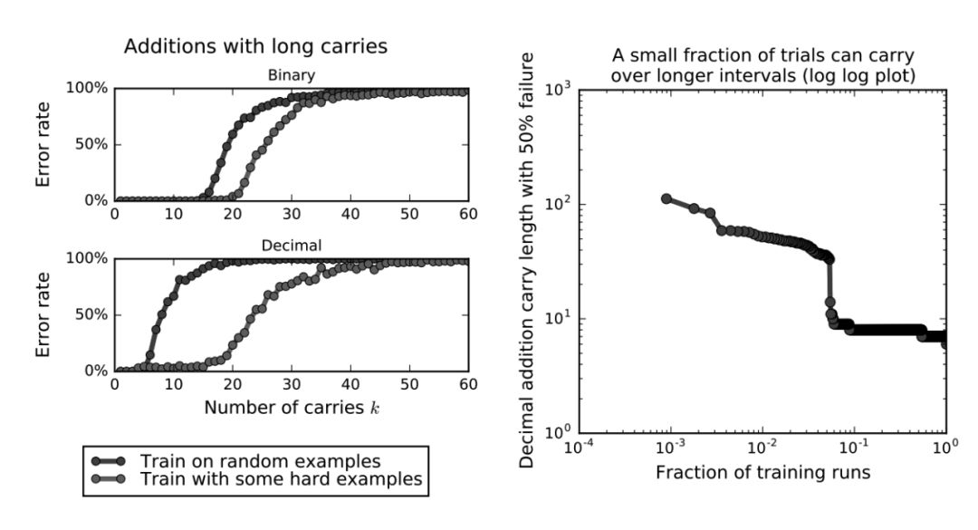 图 8:除了专业课程的学习,神经 GPU 也不能概括概念「运载」(左)。一个单独的问题是不同的初始参数会造成总体性能极大的改变(右)。