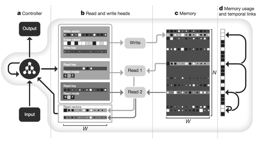图 5. DNC 图示 [14],注意 b 中有多个读向量(read vector),d 中描述了一些联结。