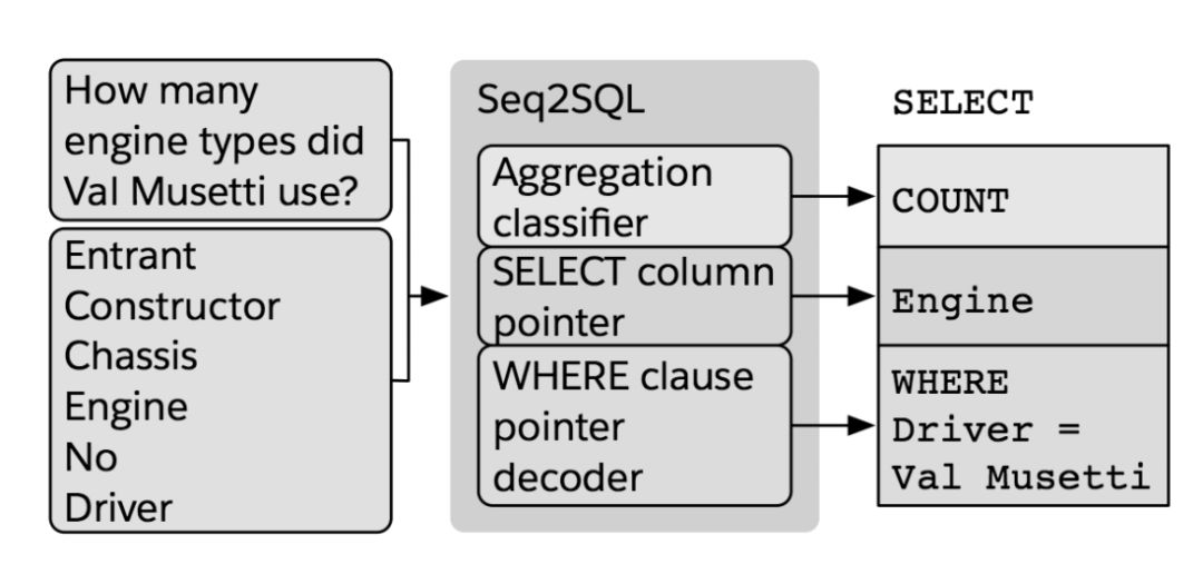 图 9. Seq2SQL [31] 用指针网络来选择问题词和列名称,以创建 SQL 查询。