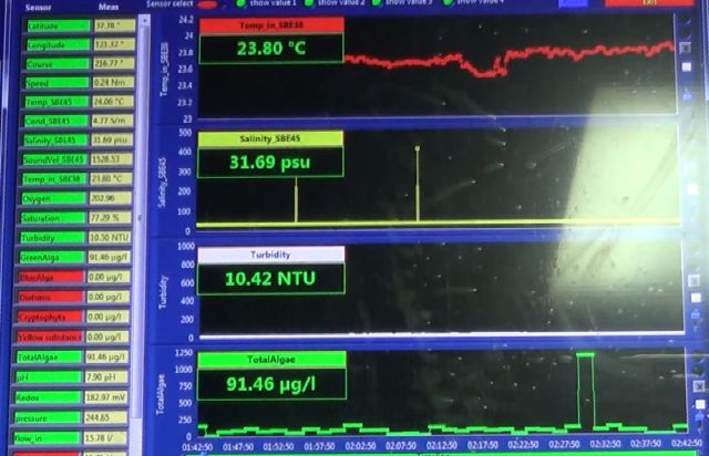 走航过程中观测表层海水的温盐、浊度、叶绿素、pH、溶解氧、藻类等参数。