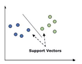 在上图中,我们有两个特征,因此我们首先需要在二维空间中绘制这两个变量,其中每个点有两个坐标,称为支持向量。该行将数据拆分为两个不同的分类组。这一行是分类器。