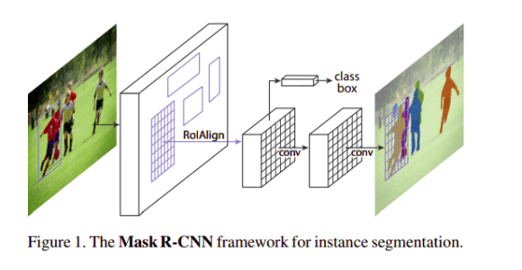 在这个架构中,使用边界框和语义分割将每个像素划分为一组类别,对对象进行分类和局部化。对每个感兴趣的区域得到一个分割掩码,生成一个类标签和一个边界框作为最终输出。该架构是Faster R-CNN的扩展。Faster R-CNN由regions proposer和深度卷积网络和利局部检测器组成。这里是COCO测试集中的一张图像的结果: