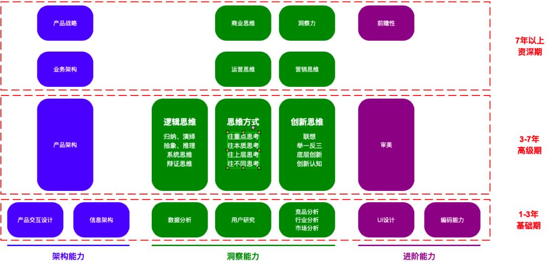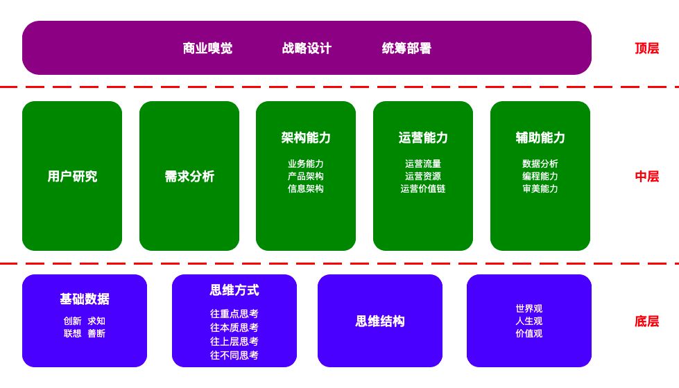 本来其实是John的读书笔记,更多的是看到这本书后结合自己的工作经验,输出自己的想法和思考。针对产品经理的能力树,John结合书本与自己的思考按底层、中层与顶层将其划分三个层次的能力,本文也将按照这个逻辑进行展开。
