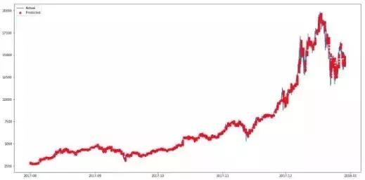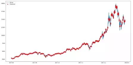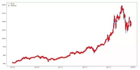 下图中的蓝线表示真实值(实际价格数据),而红点表示预测的比特币价格。