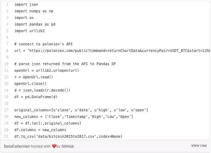 用于分析预测的数据可以从Kaggle或者Poloniex上收集到。 为确保在不同数据集之间代码适用的一致性,从Poloniex上收集数据的列名都会更改为与Kaggle相匹配的列名。