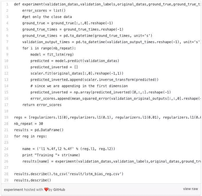 为了找到较佳的正则化方案,我用L1和L2在不同的几个值中实验。 首先,我们需要定义一个新的函数来使得数据能够拟合到LSTM中。 在这里,我将使用在偏置正规化方法对偏差向量进行正则化。