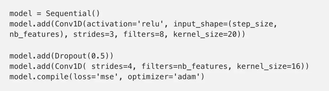 构建CNN模型的代码是非常简单的。加入dropout层是为了避免过拟合问题。 损失函数的定义为均方误差(MSE),而优化器选用较先进的Adam自适应优化。