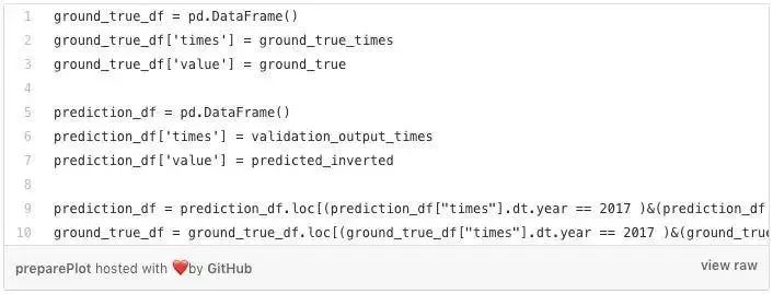 如上所示的两个Dataframes分别构造了真实值(实际价格)以及比特币的预测价格。 为了更好的可视化,绘制的图像只显示了2017年8月之后的数据。