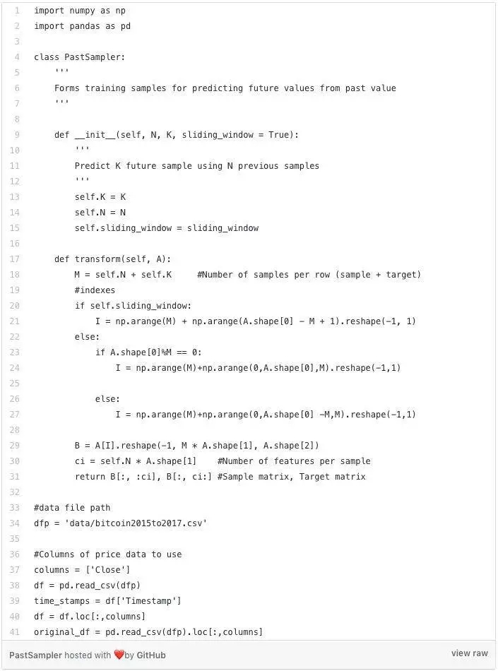 从数据源收集而来的数据需要先被解析一下才能送到模型中进行预测。下面代码中,PastSampler类是参考这个博客上的方法将数据分成一列子数据集和相应的标签数据集。模型输入数据大小(N)为256个,输出大小(K)为16个。