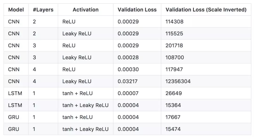 上表中的每一行都是从100个训练周期中得到的较佳验证损失的模型。 从以上结果可以看出,LeakyReLU似乎总是比通常的ReLU产生更好的损失效果。 但是,使用Leaky ReLU作为激活函数的4层CNN模型会得到较大的验证损失值,这可能是由于重新验证的模型所导致的问题。 CNN模型可以训练得非常快(使用GPU时,2秒/周期),在性能上要比LSTM和GRU稍差一点。 虽然3层CNN似乎可以更好地捕捉数据的局部时间依赖性,但较好的模型似乎是用 tanh和Leaky ReLU作为激活函数的LSTM模型。